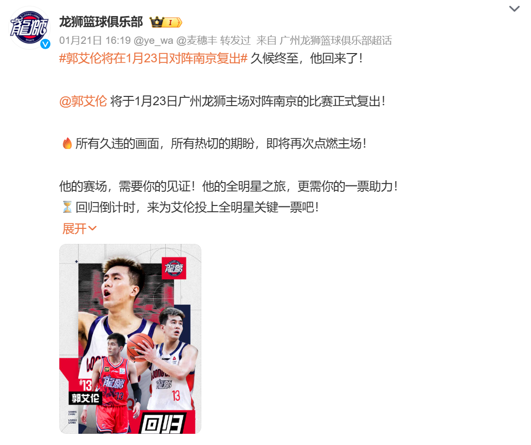 目前广东的气温很低,愿意去看球的球迷正在变少,但广州龙狮男篮此时官宣郭艾伦复出,还是对于球队有着非常明显的帮助,也是为郭艾伦的全明星投票进行了很好的拉票。